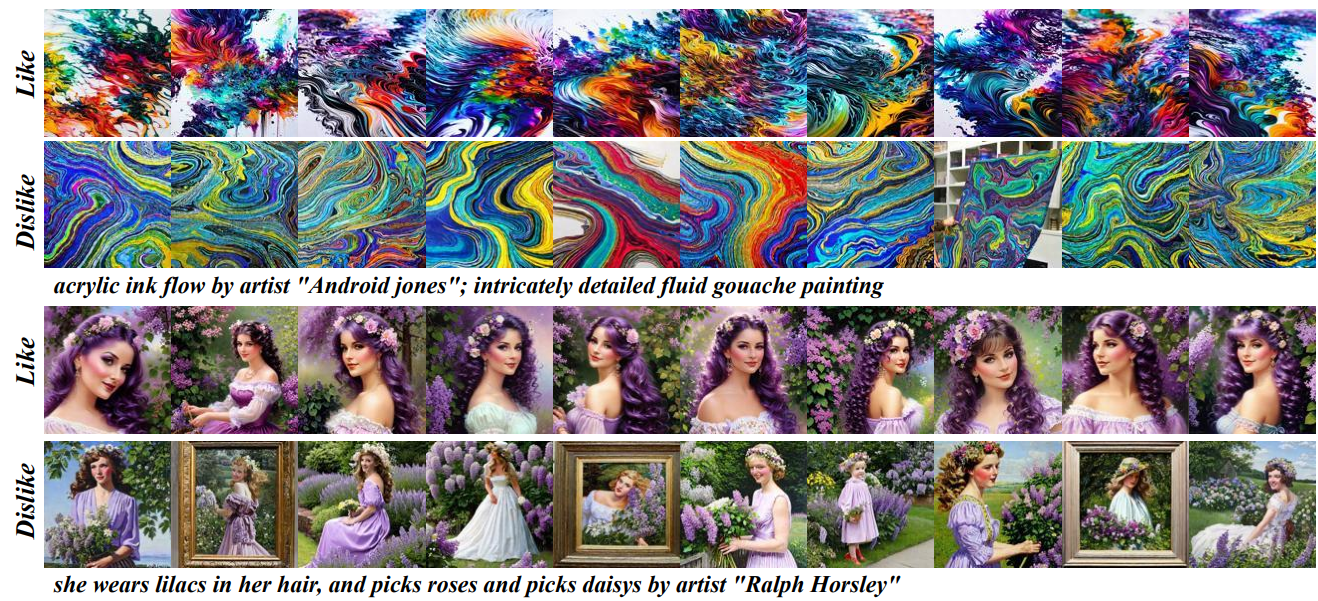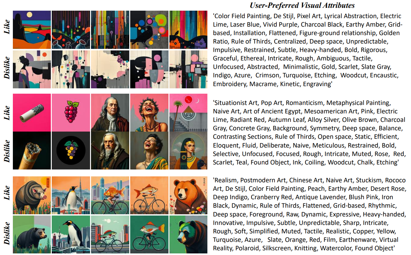 esem: extracted from the top 4 layers (last-token pooling) — captures like/dislike semantics and styles used for aligning to text space. ecore: middle-to-upper layer embeddings — capture stable user identity signals that generalize across prompts. esem through a small MLP and minimize MMD against paired CLIP text embeddings (attributes). Distribution-level loss preserves diversity and avoids collapse that point-wise losses can cause. e_u = [ĕsem; ecore; eimg], where eimg is a CLIP image embedding from a liked example. Inject into the diffusion UNet via a parallel user cross-attention branch. Agent dataset: ~990,998 generated images from 50,153 simulated users (each agent has ~50 attributes; we sample like/dislike pairs). This large-scale synthetic dataset provides controlled and diverse preference signals, enabling robust training of our preference extraction and alignment modules.